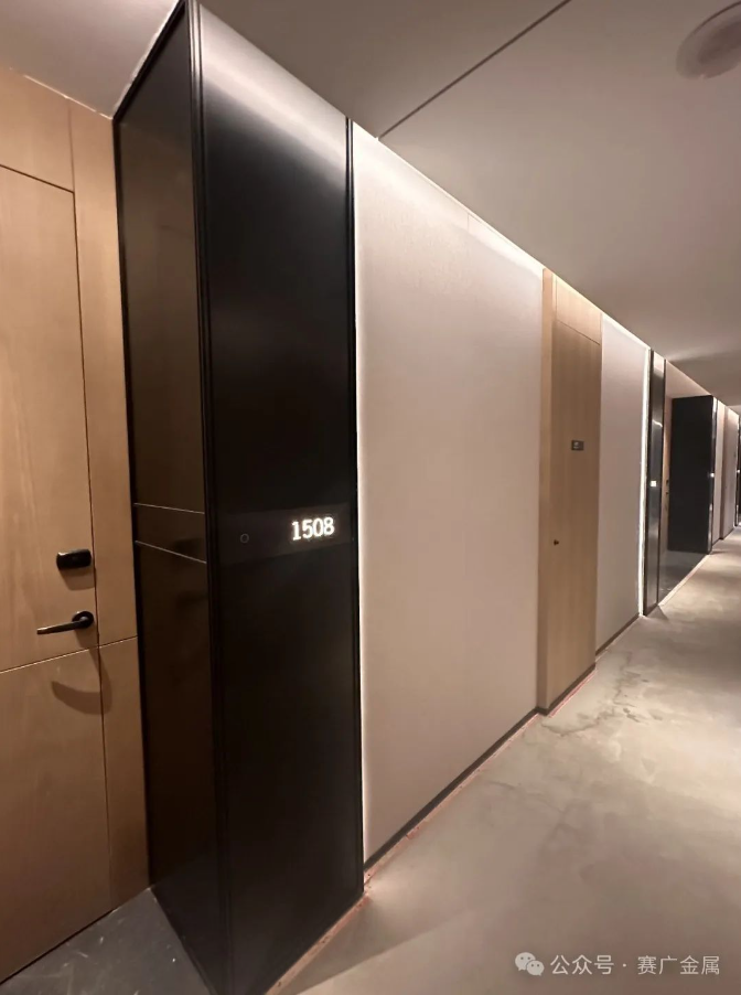 酒店內(nèi)部運(yùn)用大量不銹鋼包板及線條進(jìn)行裝飾,顏色大多為黑鈦噴砂,此色因其獨(dú)特的啞光材質(zhì),彰顯出低調(diào)奢華的質(zhì)感,為空間營(yíng)造出高級(jí)的氛圍感。