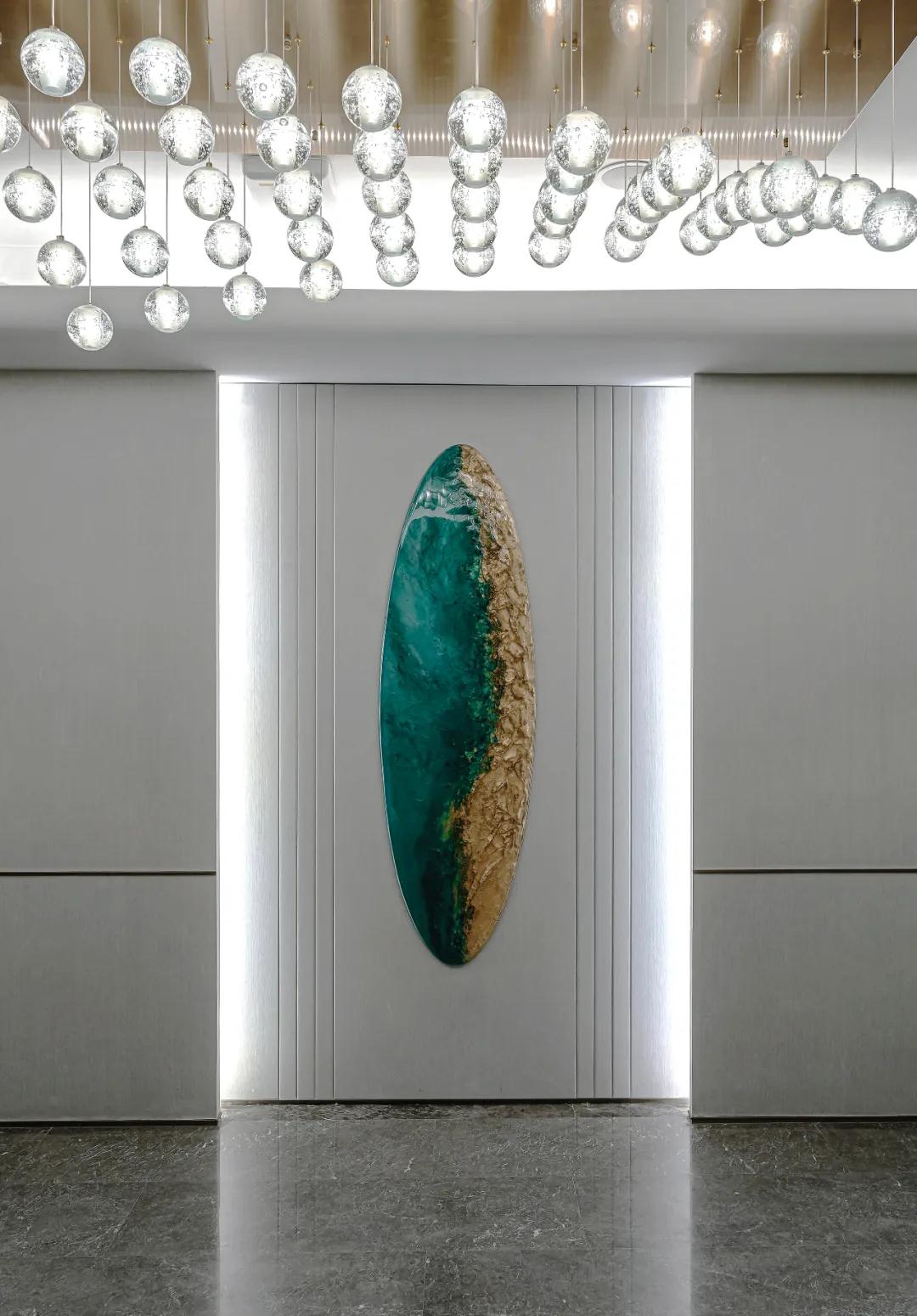 前廳鋪陳明凈底色與質(zhì)感紋路,圍繞“星辰”主題,以典雅燈光比興自然天光,錯(cuò)落有致的水晶猶如璀璨銀河,落在海藍(lán)色藝術(shù)裝飾上,折射出深邃的奇幻星空,以傲然姿態(tài)探尋生命的藝術(shù)。