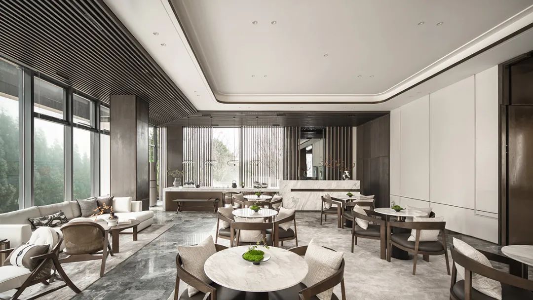 透過玻璃幕墻,最大程度引入自然光線,極目遠眺,飽覽山之綠,坐擁水之秀。將取于自然的元素化為極具美感的線條與體感,賦予空間現(xiàn)代與傳統(tǒng)交融并濟的融合氣質。